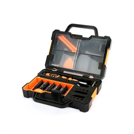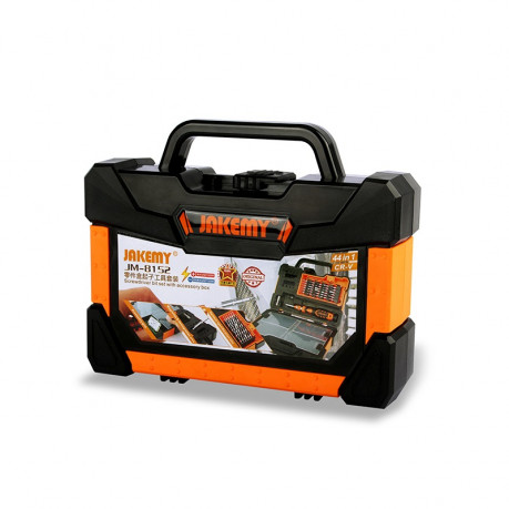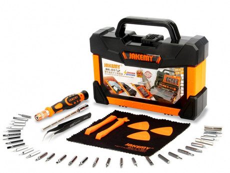 Набор JM-8152 предусмотрен для ремонта электроники: смартфона, ноутбука, игровой приставки, фотоаппарата, часов и т.д., но в наборе также есть и крупные биты, которые подойдут для мебельной фурнитуры. Поставляется в компактном и портативном кейсе в виде чемодана габаритами – 220х175х60мм и весом 800г. Кейс оснащен надежным двухтактным замком, внутри кейса предусмотрены специальные отсеки для хранения и классификации мелких запчастей. Рано или поздно любая отвертка-держатель нуждается в подмагничивании битодержателя, поэтому в кейсе предусмотрена зона намагничивания и размагничивания – теперь не нужно беспокоится о наличии дополнительного магнита.