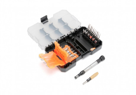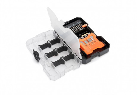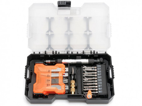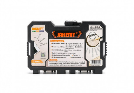 Опционально набор укомплектован 4 видами инструментов: лезвия, биты, сверла и накидные ключи. Все инструменты предусмотрены для прецизионных и мелких работ. Также набор JM-8158 подойдет и для гравировальных работ.