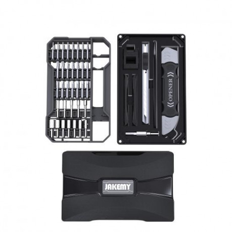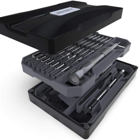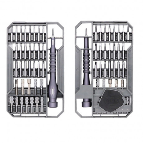 Набор поставляется в стильном кейсе с многослойным дизайном размером 174*105*36 мм; общий вес набора – 558г. Ячейки для бит намагничены, за счет чего они удобно в них размещаются и не выпадают. Комплект бит подобран таким образом, что подойдет для ремонта часов, камер, ноутбуков, мобильных телефонов и другой техники. Биты выполнены с высокой точностью, присутствует двойная антикоррозийная обработка. Держатель бит покрыт анодированым алюминием, противоскользящий, предусматривает удобный упор для пальца. Все инструменты набора изготовлены из долговечного хроммолибденового сплава S2.