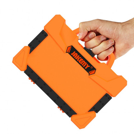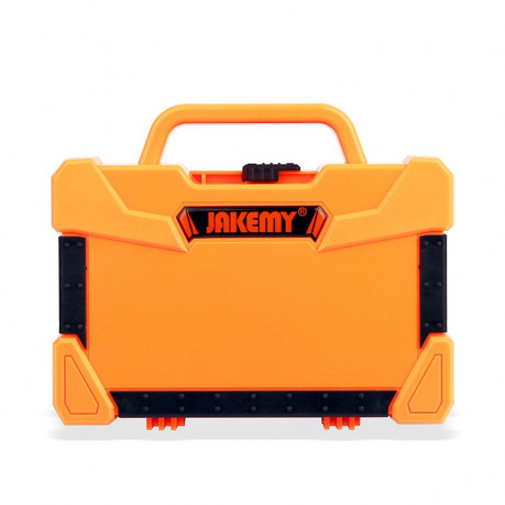 С помощью набора JM-8139 от производителя Jakemy можно произвести ремонт смартфона, ноутбука, дисплея, бытовой техники как в домашних условиях, так и в мастерской или на выезде. Набор JM-8139 поставляется в кейсе-чемодане из ударопрочного ABS-пластика с прорезиненными вставками. Открывая кейс после переноски, Вы обнаружите, что все инструменты остались на своих местах, а сам кейс-чемодан оснащен двухтактным замком для надежной транспортировки. Габариты чемодана в сложенном виде довольно компактные - 20х14х6 см, а в разложенном – 27х20см. Рассмотрим его наполнение более детально. В набор входит рукоятка отвертки из нескользящего пластика длиной 117мм c дополнительным удлиняющим битодержателем H4x60мм и бит из CR-V сплава следующих видов шлицов: