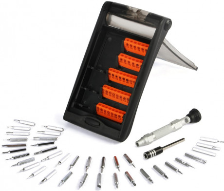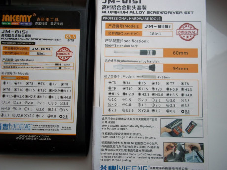 В комплект JM-8151 входит противоскользящая рукоятка эргономичной формы из алюминиевого сплава и прокручивающимся колпачком (94мм), намагниченным битодержателем и удлиняющим стержнем (55мм); 36 сменных насадок (размером 4*28мм) из стали 6150, покрытых CR-V сплавом следующих видов: