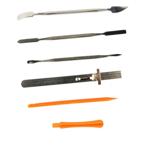 Также набор дополнен следующими ручными инструментами для полноценного ремонта: присоска для поднятия экрана; рычаг-медиатор для вскрытия корпуса; три металлических двухсторонних лопатки-спаджера из нержавеющей стали высокого качества с противоскользящей рукояткой различных форм; линейка; 4 антистатические лопатки-шпателя из полиформальдегидного волокна и стекловолокна обладают высокой прочностью и износостойкостью.В комплект входят изогнутый и прямой пинцет с острыми наконечниками и прямой пинцет с закругленными наконечниками; оловоотсос; антистатический браслет изготовлен из нейлона и специальной пряжи.